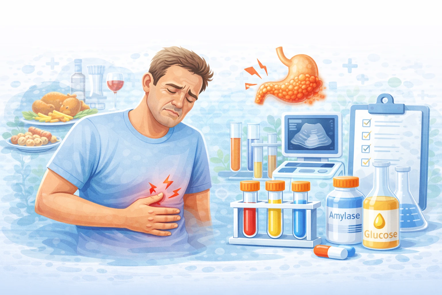 Базовий набір: амілаза та ліпаза в крові (показують активність ферментів), загальний аналіз крові (виявляє запалення), ліпідограма (оцінює жировий обмін), глюкоза (підшлункова виробляє інсулін). Додатково можуть призначити УЗД черевної порожнини, щоб побачити розмір і структуру залози.