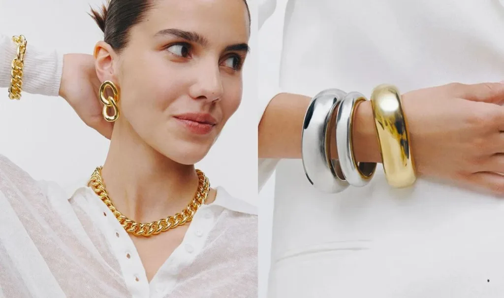 Зима 2025/2026 делает сочетания металлов более свободными. Жесткое правило «только один цвет металла» больше не актуально. Важно, чтобы украшения формировали цельную линию образа: теплые оттенки золота соседствуют с холодными серебристыми поверхностями, создавая многослойный результат.