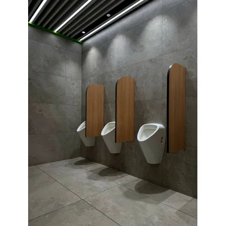 Пісуарні перегородки мають простішу конструкцію. Це компактні панелі без дверей, які монтуються між сантехнічними приладами. Їхня висота нижча, ніж у кабін, тому простір не виглядає важким, а прибирання займає менше часу.